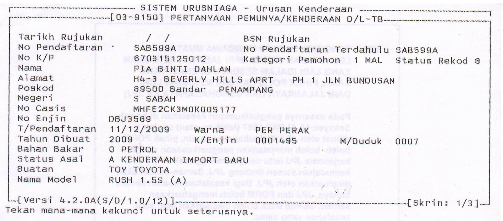 SAMAN.....Kereta SS5551A telah disaman pada 9 Mei 2004 di Jalan Teratai Lahad Datu melalui saman bernombor 001M159279 atas kesalahan tiada lesen memandu. Inilah saman pertama Pia setelah mendapat IC Projek dengan bantuan daripada Datuk S.